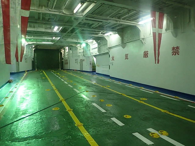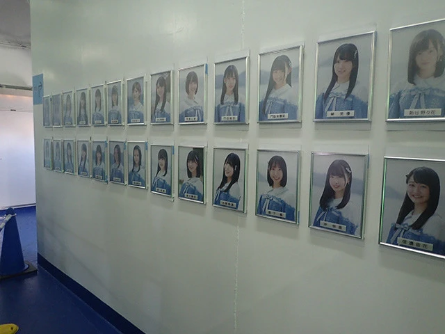その後、船内でお披露目ライブと内覧会が行なわれた。気になる船だが、もともと九州で運行していたフェリーを改造したもの。入ると、かつては車を置いていた大きなスペースが広がる。壁には他の48グループの劇場と同様にメンバーのプロフィール写真が貼られている。