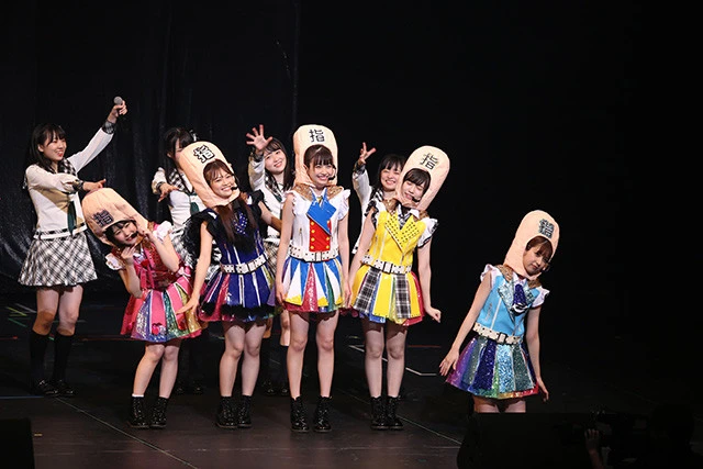 HKTコンサートの名物となっている寸劇コーナー。今回は「寸劇戦隊・指レンジャー」。かつてはグズグズっぷりが楽しみのひとつでもあったが、演じるメンバーもスキルもあがり、純粋に楽しめるように。特に悪役を演じる村重杏奈がイキイキとしていた。