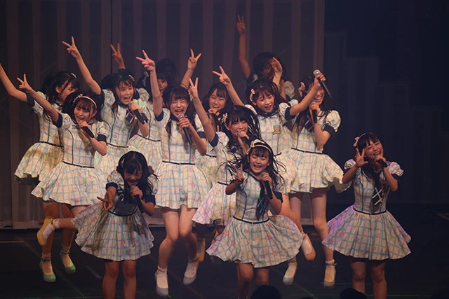 歌い終わるとメンバーは舞台をはけ、キラキラしたステージ衣装にチェンジ、本編がスタート! 『桜、みんなで食べた』、『ぶっ倒れるまで』、『初恋バタフライ』、『早送りカレンダー』と一気に飛ばしてくる。中心となるのは田中美久と松岡はな。元気いっぱいにステージを盛り上げる。