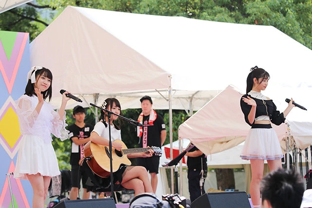 自己紹介では白岡がグループのことを「透明度MAX美少女ユニット」と説明、会場からは「フ―――」と大きな歓声があがる。そして再び『恋するスカート』を通常バージョンで爽やかなダンスとともに披露。それぞれのファンは全力コールで3人の熱演に応えていた。