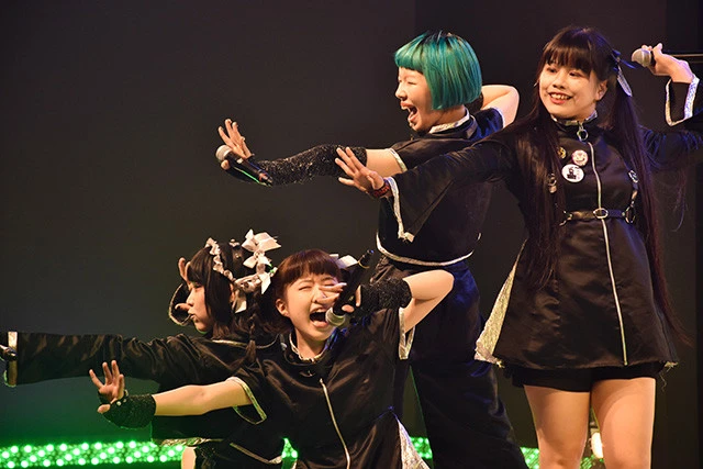 賛美歌チックなBGMが流れる中、全身黒色の衣装で登場した彼女たちは、『officialfake』『叛逆starmine』というロックテイストの2曲を続けて披露。メインボーカル・南向(なさき)いずみが歯切れのいい声で歌う低音と、冬野あゐく&戸田ころねが歌う高音パートのハモリが心地いい。"崇拝者"と呼ばれる彼女たちのファンも、重いドラムに合わせて首を振り回す。