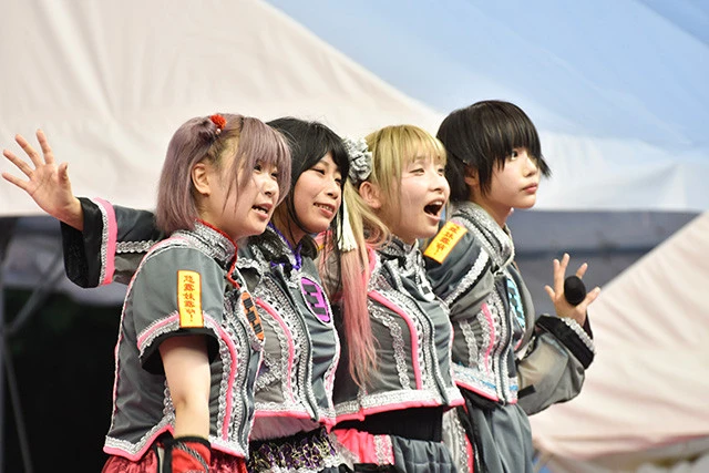 その後はMCを挟みつつ、『キメマスター!』『しゅっとこどっこい』『夏のOh!バイブス』と、転調だらけのカオスな代表曲&新曲を連発。空調が効いたメインステージとはいえ、"演奏"と"楽器を置いてのダンス"をめまぐるしく繰り返す彼女たちが感じる暑さは相当のものだろう。大桃子の「(メイクが落ちて)アイドルじゃなくなっちゃいそう......」というつぶやきには、思わず笑いそうになりつつもうなずいてしまう。