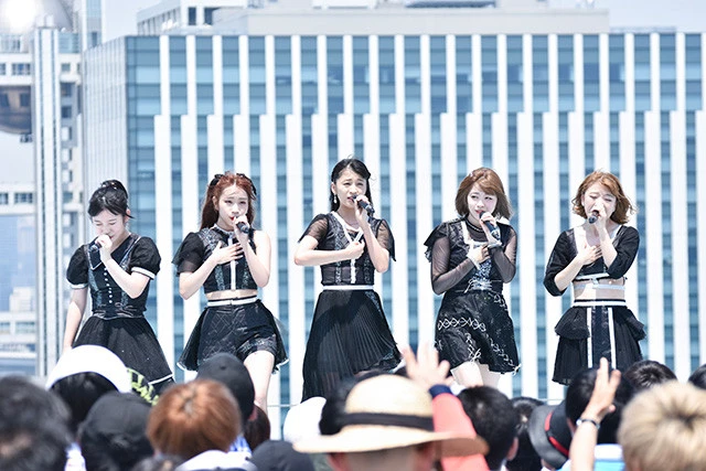お台場の屋上にさっそうと現れたのは、5人組グループ・DEAR KISS。クールな出で立ちの彼女たちのステージは、アップチューンなダンスナンバー『REIMEI』でクールにスタート。ラップもアリ、ヘドバンもアリのこの曲を、汗なんて気にもせず、髪を振り乱して踊っていく。