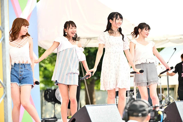 続いて歌うのは『じゃじゃ馬と呼ばないで』。松井さやかの力強い声が会場を引っ張る。寺田 葵の癒しの笑顔にドキッとさせられる。岡田夢以(めい)の白いワンピースが、これでもかというほどにひるがえる。強い夏ライブ感。生きた声がハッキリと耳に飛び込んでくる。左右に振る手のひらが夏を呼び込む。テンションが上がる!