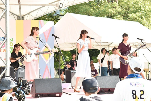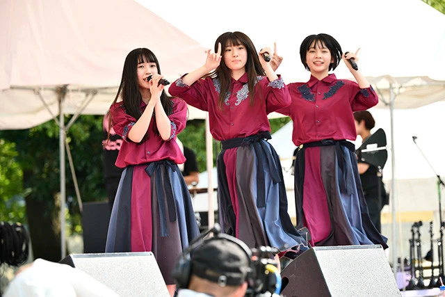 二曲目は『Summer plan』と、夏ソングを続けて披露した後は、3人体制になってからの初シングル。7月にリリースしたばかりの『ささやかな祝祭』へ。TVアニメ『ダンジョンに出会いを求めるのは間違っているだろうかⅡ』のエンディングテーマにも使われているこの曲。弾ける音楽。笑顔の3人。冒険の酒場でのハッピーな宴のようなこの曲。