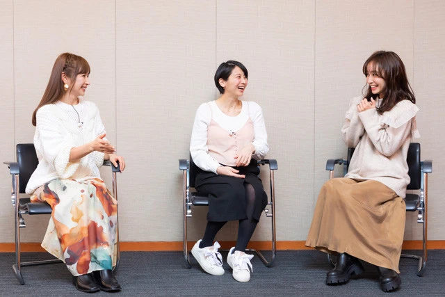 左から、愛川ゆず季、相澤仁美、木口亜矢。相澤さんのおなかには新しい命が! 先輩ママふたりが終始、体調を気遣う和やかな取材になりました(※相澤さんは、2月7日に第1子女児を出産されました)
