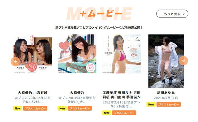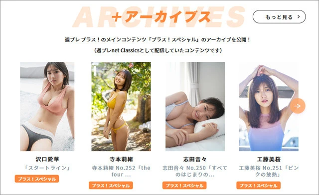 「+スペシャル」のアーカイブコーナーで、前身の「週プレnet」時代に配信された、約100本に及ぶグラビアコンテンツが見放題。そのラインナップは、沢口愛華、逢沢りな、大原優乃、工藤美桜、小松彩夏、小宮有紗、鈴木ちなみ、寺本莉緒、武田玲奈、吉木りさなど......レジェンドたちのグラビアが堪能できる。