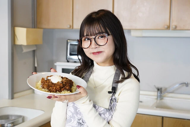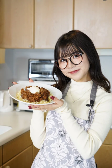 今回、高梨はサッポロ一番とハンバーグを使った新感覚パスタ「ひき肉濃厚MAX! サッポロ一番パスタ」に挑戦。先日リリースされたばかりのデジタル写真集『ほっぺをツンツンしていい?』への想いとともに話を聞いた。