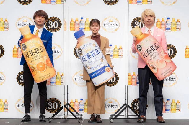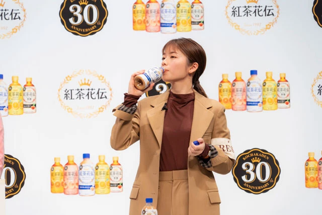 1992年に誕生し、30周年を迎えた「紅茶花伝」は、「ロイヤルミルクティー」「クラフティー 贅沢しぼりピーチティー」「贅沢しぼりオレンジティー」の3商品をリニューアル。CMも刷新し、昨年から出演する小芝が今回は記者役となって、おいしさの秘密に迫っている。