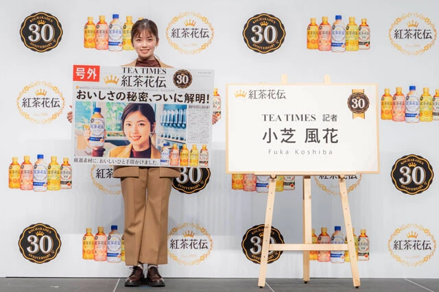 イベントでは小芝がCMと同じ、架空の紅茶専門紙『TEA TIMES』の記者として登壇。会場に現れるや「『TEA TIMES』の号外が発表されました!」とノリノリ。さらに"公開取材会"として「まだ勉強不足なところもありまして、この取材会で皆さんが驚くほどのニュースを3つは見つけて帰りたいです。なぜ『紅茶花伝』が30年もの間、愛され続けているのか、その秘密を暴きたいと思います!」と意気込んだ。
