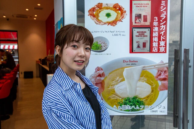 村田さんが注文したのは、もちろん名物の『らぁ麺生ハムフロマージュ』(1280円・税込)。鶏ガラベースで昆布やホタテの旨みをきかせた黄金色のスープに、ゴルゴンゾーラ入りのクリームチーズ。楕円形の独特な器の外側には、薄くスライスされた生ハムが!