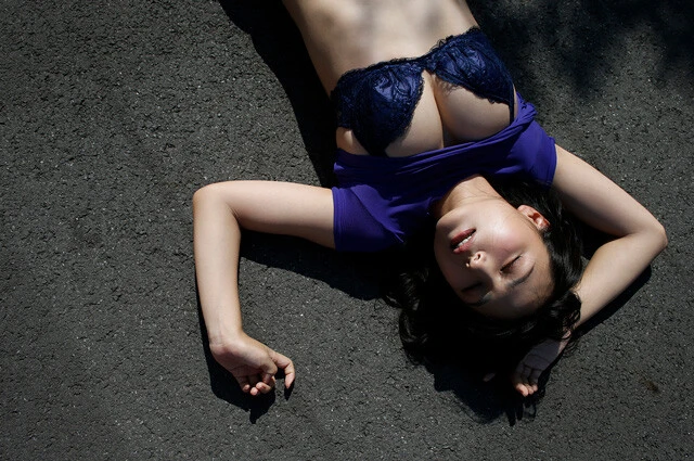 とり それから『DARK SEA』のなかだと、私はこの衣装を着ているシーンが大好きで。シャツをたくしあげて胸を露わにし、中途半端にズボンを下ろしてお尻を出し、乱れ髪も半開きの口も気にせずにアスファルトの上で寝転がっている......。何だか野生的ですよね。この一連のカットだけで、川村さんが"自分を開放している"とは言い切れないものの、普段だったらできないことを自由にやれる快感みたいなものはあるんじゃないかなぁと思うと、やっぱり興奮します。 デジタル写真集『Into~2部作~ vol.1 Into the DARK SEA』(撮影/小塚毅之)より