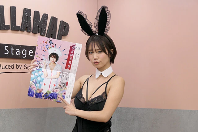 カレンダーのサイズはちょっと小さめではありますが、逆にどこにでも飾れそうなポップでおしゃれな仕様となっております。取材タイムは干支にちなんで、表紙も飾っているバニーガール衣装での登場。イメージDVDは卒業していますが、トレーディングカードとカレンダーは毎年リリースが続いています。2023年には撮影会に出ることも検討中とのことでした。