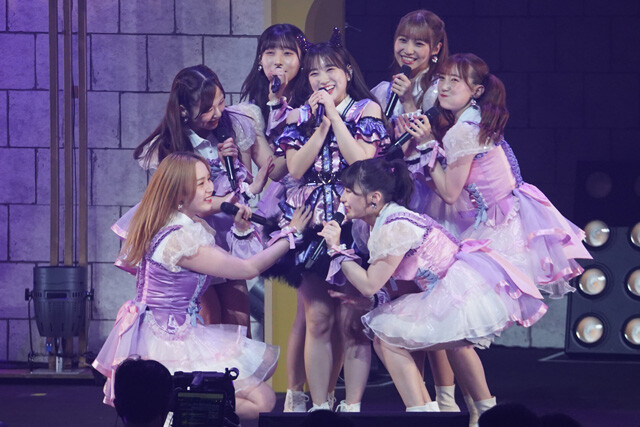 可愛さ全開の『いじわるチュー』では、これまで出演したOGに加えて村重杏奈が登場。新バラエティクイーンとして芸能界を席巻中の村重、矢吹がソロで乗る予定だったゴンドラに乱入してファンの視線を独占。さすが勢いあるメンバーはやることが違う! 主役を取られて矢吹は苦笑い