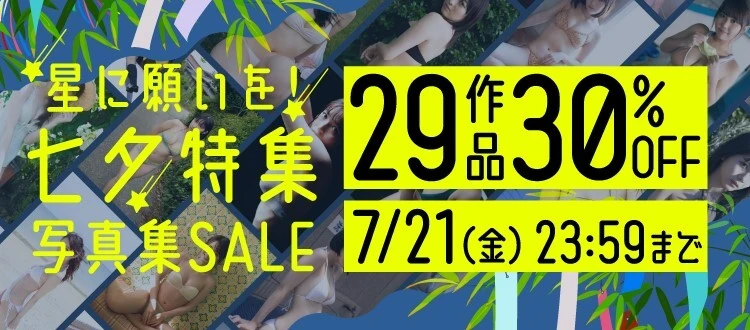 こんな夜こそグラビアを。現在、【週プレ グラジャパ!】では「星に願いを 七夕特集」を開催中です。名前に「七(なな)」「織」「姫」「星」など、七夕にまつわる漢字が入っているモデルのデジタル写真集29作品をピックアップ。期間限定で30%OFF SALEしています。期間は、7月7日(金)から7月21日(金) まで。
