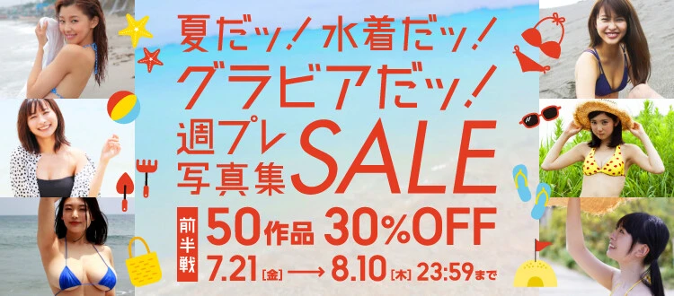 そんなみなさまに朗報です。現在、【週プレ グラジャパ!】では、人気デジタル写真集100作品が30%OFFでおトクにゲットできる「夏だッ!水着だッ!グラビアだッ!週プレ写真集SALE」が開催中です!