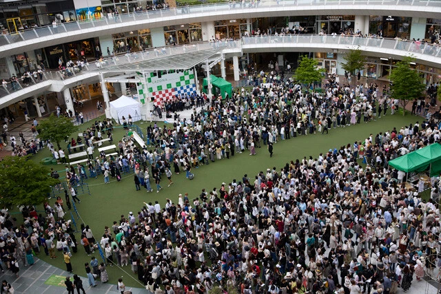 お客さんはメンバー全員と握手してから投票チケットをもらい、どちらかに記入して投票をしていく。投票に来ていた方々は家族連れや友人同士など、ちびっ子からお婆さままでファンの年齢層も幅広い。整列中もグッズや手作りのうちわを持ってメンバーにアピールするファンも多く、まるでライブ会場のような雰囲気に。イベントをまったく知らない人も「ここで何があるんですか!?」と聞いてくるほどお祭り騒ぎになっていた。