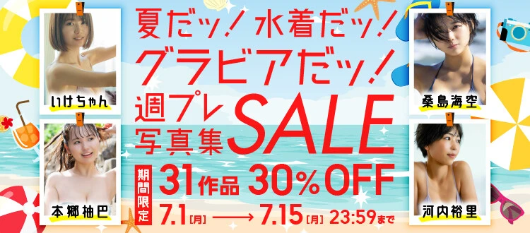今年も夏がやって来る〜〜〜ッ! ジメジメとした天気が続いていますが、梅雨が明けたらみんなが大好きな季節の到来です。夏といえば、水着。水着といえば、グラビア。ってなわけで、【週プレグラジャパ!】では、7月1日(月)から7月15日(月)にかけて「夏だッ!水着だッ!グラビアだッ!週プレ写真集SALE」を開催! 対象のデジタル写真集31作品が30%OFFにてGET出来ちゃいます〜!