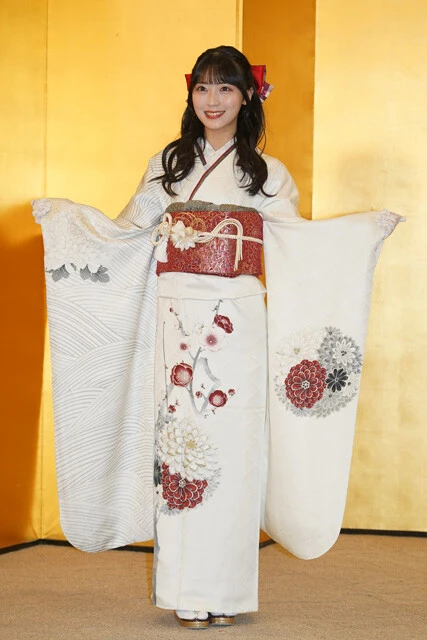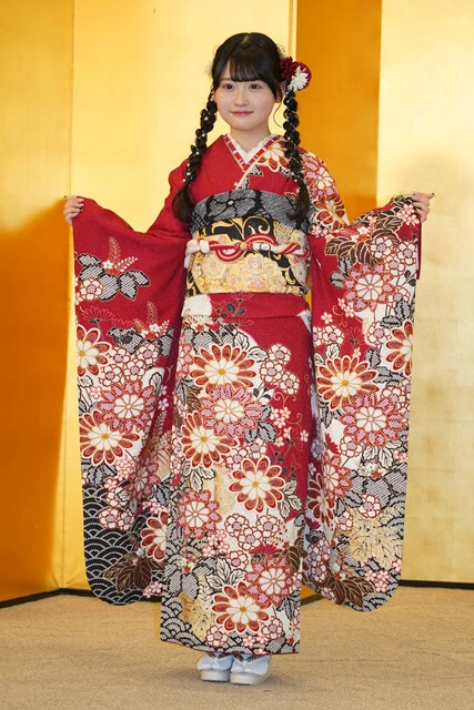 山﨑は晴れ着のポイントについて、「大人ということで、深みのある緑を選びました。大きな花柄だったり、ゴールドのラインが大人っぽくてお気に入り。髪型は横でまとめさせていただいて、大きな花をつけて、統一感ある大人っぽい雰囲気にしてみました」と語る。