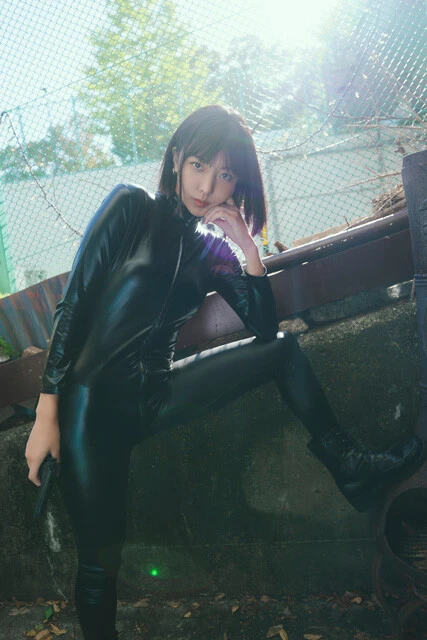 はまの 黒のタイトな『GANTZ』風ボディスーツです。こういう衣装を着たかったんですよ。好きなアニメは『GANTZ』ってお話をしたら、その世界観を取り入れてくださって。お洋服着た状態から始まって、寝て起きたら転送されて肌の露出が高くなって濡れていくみたいな(笑)。