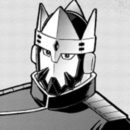 長く伸びた角が最大の特徴。右肩アーマーにはドクロが描かれており、左右の腰と左腕には小型のメカを装着している。