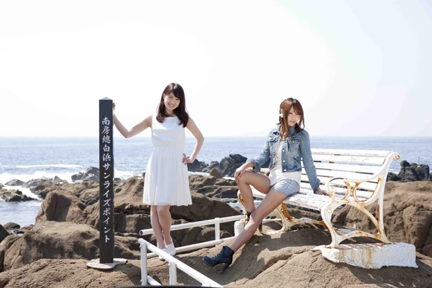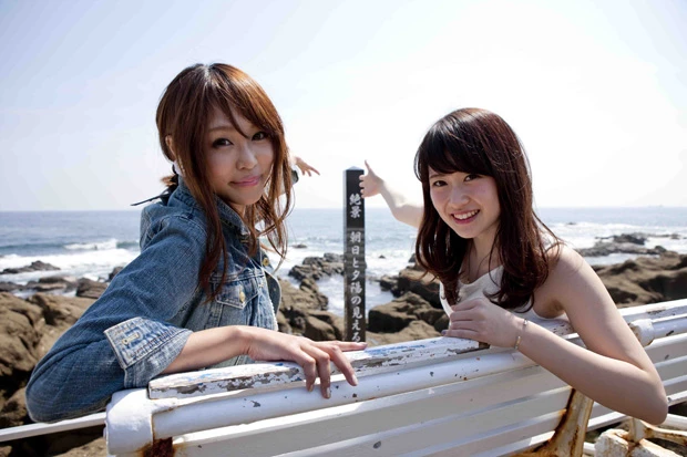 今回デートしてくれた小野小百合ちゃん(左)と野地優奈ちゃん(右)。東京湾アクアラインの中間に位置するパーキングエリア「海ほたる」で、お約束の休憩&写真撮影!