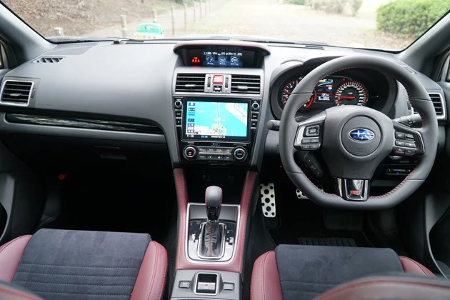 またインテリアではSTI Sportのテーマカラーである「ボルドー」を採用。シフトレバー周りのセンターコンソールやアームレスト、ドアトリム、そしてシートなどにも差し色として使われており、大人っぽい雰囲気を醸し出している。
