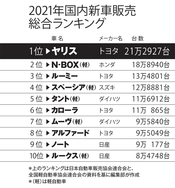 山本 日本自動車販売協会連合会と全国軽自動車協会連合会の発表があり、トヨタのヤリス(ヤリス、ヤリスクロス、GRヤリスの合算)が2021年の新車販売総合ランキングでホンダの軽N-BOXの5連覇を阻止しました。