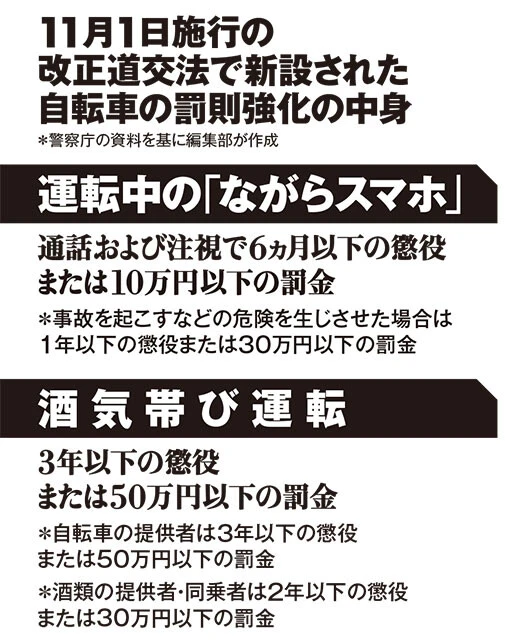 「簡単に言ってしまえば、自転車もバイクやクルマ同様にながらスマホや酒気帯び運転が罰則の対象になりました。詳しくは表にまとめたので見ていただきたいのですが、違反者には懲役刑、あるいは罰金刑が科せられます」