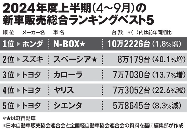 10月4日、自販連(日本自動車販売協会連合会)と全軽自協(全国軽自動車協会連合会)が2024年度上半期(4~9月)の国内新車販売ランキングを発表。それによると、総合トップに輝いたのはホンダの軽スーパーハイトワゴン・N-BOX! 2位はスズキの軽スーパーハイトワゴン・スペーシアであった。加えて、N-BOXはランキングで唯一となる10万台超をマークし、2位に2万台超の差をつける圧勝ぶり。