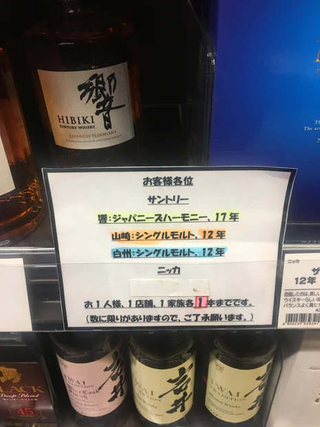 酒販店の国産ウイスキーの棚には写真のような注意書きが張られていた。小売店でも十分な在庫の確保が難しくなっているのが国産ウイスキーの現状なのだ。