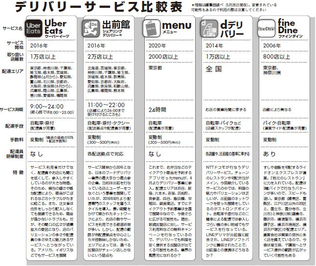 UberEats(左)と出前館のアプリ画面ひと昔前は「出前」と呼ばれるフード宅配サービスは、たまに利用する程度のものだった。それが数年前のUberEatsの登場により、アプリひとつで簡単に注文できる時代に。そしてコロナによるステイホームがきっかけで一気に需要が増加。今や一般的なサービスとして定着しつつある。
