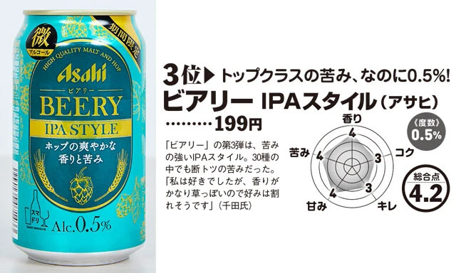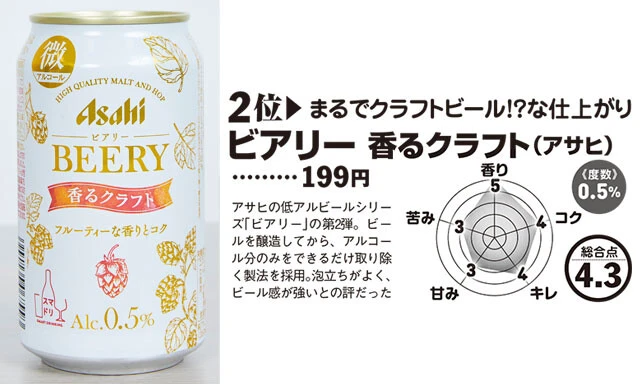 ――満場一致ですね。一方、僅差でしたが、2位と3位にはアサヒビールの微アルビールが並びました。「ビアリー」の「香るクラフト」と「IPAスタイル」です。