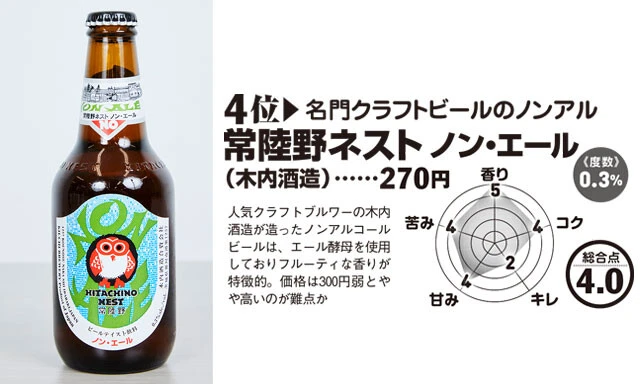 ――続く4位にはクラフトビールの名門ブランドから、「常陸野(ひたちの)ネスト ノン・エール」が入りました。