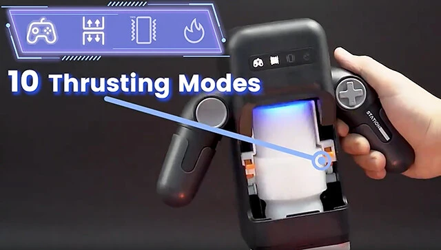 本体にスマホを装着でき、搭載されるコントローラーで動画の操作も可能。振動、ピストン、さらに温感など機能全部入りのオナホ!