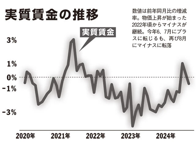 そうしたかいもあってか、6月には実質賃金(物価上昇率を加味した賃金上昇率)はプラスに転じた。ところが、この傾向は長くは続かない。6、7月はボーナスを出す会社が多かったことが大きく、その時期が過ぎた8月には再びマイナス0.6%に転じたのだ。