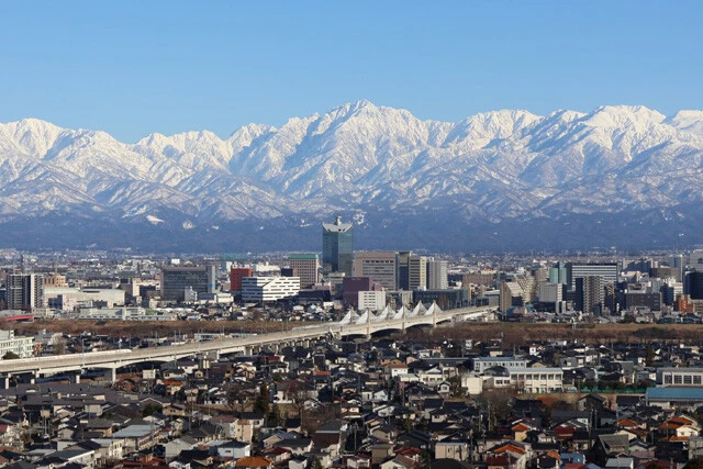 市内から望む立山連峰は絶景。中心部は路面電車の市電が走る。富山城や「世界一美しいスタバ」と称される環水公園のスターバックスなども有名な観光地だ