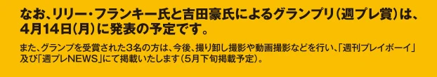 【グランプリ】★3名(一般投票賞、部長賞、週プレ賞、各1名)【副賞】★週刊プレイボーイ公式サイト『週プレNEWS』に撮り下し写真の掲載と撮り下し動画のアップをいたします。【審査員】★リリー・フランキー...