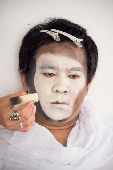 筆やスポンジでさらにベースを作っていく。白塗りされ、ほぼエレキテル連合状態……。なぜ、そこまで目がうつろになってしまうのか!?