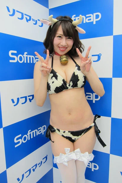 まさかの牛コスを披露してくれた早希ちゃん。「モォ~たまらん!!」とつぶやいてしまったのは記者だけではないハズ?“吉田山”と呼ばれるHカップの美巨乳を武器にグラビア界で活躍する吉田早希ちゃんのイベント(11月22日・ソフマップAMS館)に直撃!