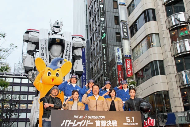ピーポくんに隠されてしまったが機体にはナンバーも付け、原作通り忠実に再現(左手前から)押井守監督、真野恵里菜、筧利夫、太田莉菜、森カンナ映画『THE NEXT GENERATION パトレイバー 首都決戦』の公開(5月1日)を記念して21日、劇中に登場する高さ8m、重量22tの巨大ロボット「イングラム」が新宿に現れた!