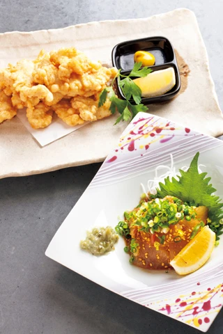 鶏天 550円(税抜き) 琉球 480円(税抜き)下味をつけた鶏肉に卵をまぶして揚げた大分名物の鶏天。それを和からしとポン酢で食べると、油っぽくなくてサッパリ! 琉球は新鮮なカンパチの切り身を醤油、みりん、酒、ゴマなどを混ぜ合わせた自家製ダレで漬け込んだもの。酒のツマミとして人気。