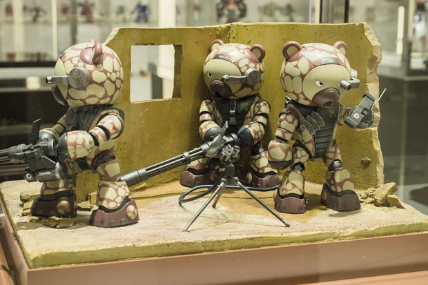 砂漠地帯で作戦行動中の特殊部隊を思わせる3機のベアッガイ。ミリタリーテイストが強めで表情&装備はガチだけど、どこかユーモラス♪ 実はこちらの作品も女のコが制作