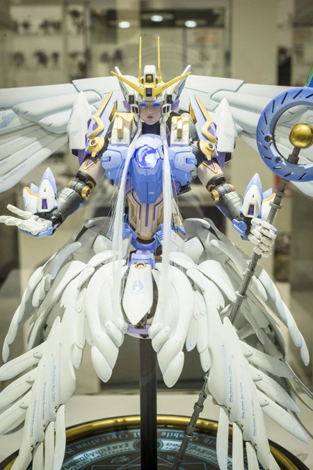 ベースとなっているのはPGのウイングガンダム。しかし、MSというより女性フィギュアのようなたたずまい! LEDでライトアップされる胸部や目、そして丁寧に分割された指など、その造形テクはかなり高いものになっている