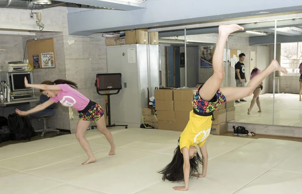 続いて、マットが広がる道場に移動。マット運動へーー。前転、後転、開脚前転、開脚後転、側転や倒立前転など、ぐるんぐるんと回る。
