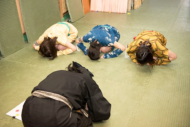 『グラバカ! ライブ編』に向け、3人の気合いも充分。習志野組頭の指導の下、修行が始まった。まずは、忍者が任務を行なう前に心を鎮めるために行なう「九字法」で場を清める。道場に、ピンと緊張が走った。