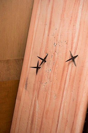 投げ方をしっかりと習った後、実際にメンバーが的である板に向って投げてみる。ザクッ!と、板に勢いよく突き刺さる手裏剣!