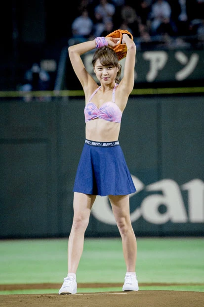 松元はピンクのビキニ姿でグラウンドに登場。露出も多く、身長168cm、W55のスレンダーなスタイルがひと際目立つ。球場スタッフも思わず「あのコ、細っ!」と呟(つぶや)き、目を奪われてしまうほど…。