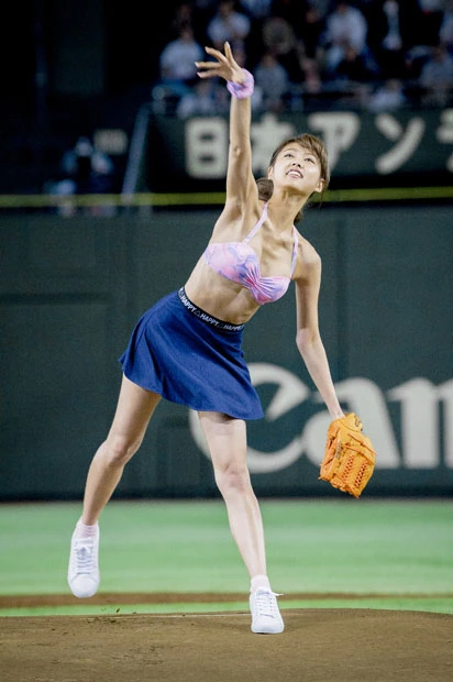 東京ドームという大舞台で、さらに初めての始球式ながら、タメにタメてボールにキスという虚を突くパフォーマンスで満員の観客にインパクトを与えるとは…大物すぎる!? そこで、週プレNEWSでは始球式を終えたばかりの彼女を直撃した!