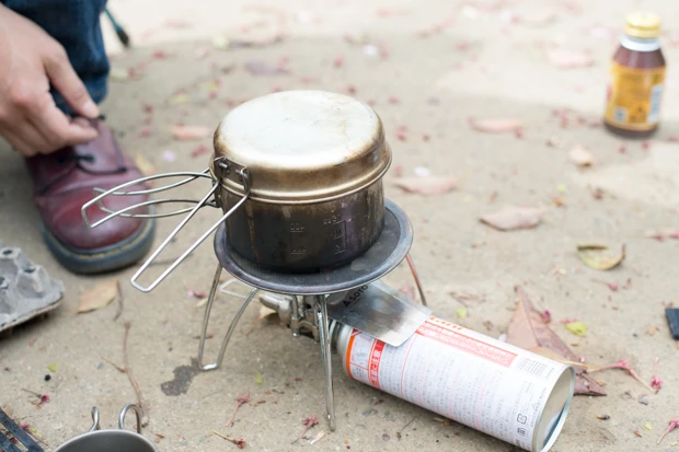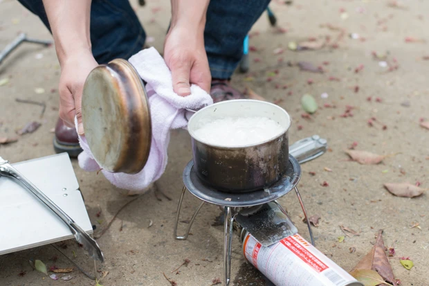 ヒロシ 使用器具だけど、初心者の人だったら火力の調整が簡単なコンロがいいかな。俺が使っているのはSOTOの折りたたみのコンロ(レギュレーターストーブ ST-310 6千円+税)。このタイプがいいのは、普通に100均とかで売っているガスボンベが使えること。コンロで炊く時はバーナーパット(網)を1枚置くだけで、火がまんべんなく回って失敗がなくなります。
